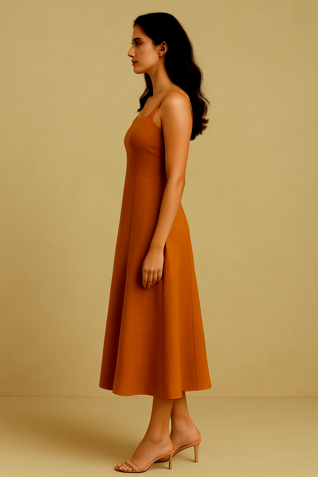 Turn heads with understated elegance in this Mustard sleeveless midi dress. Designed with a flattering square neckline and wide shoulder straps, the dress features a fitted bodice that flows into a gently flared hemline.