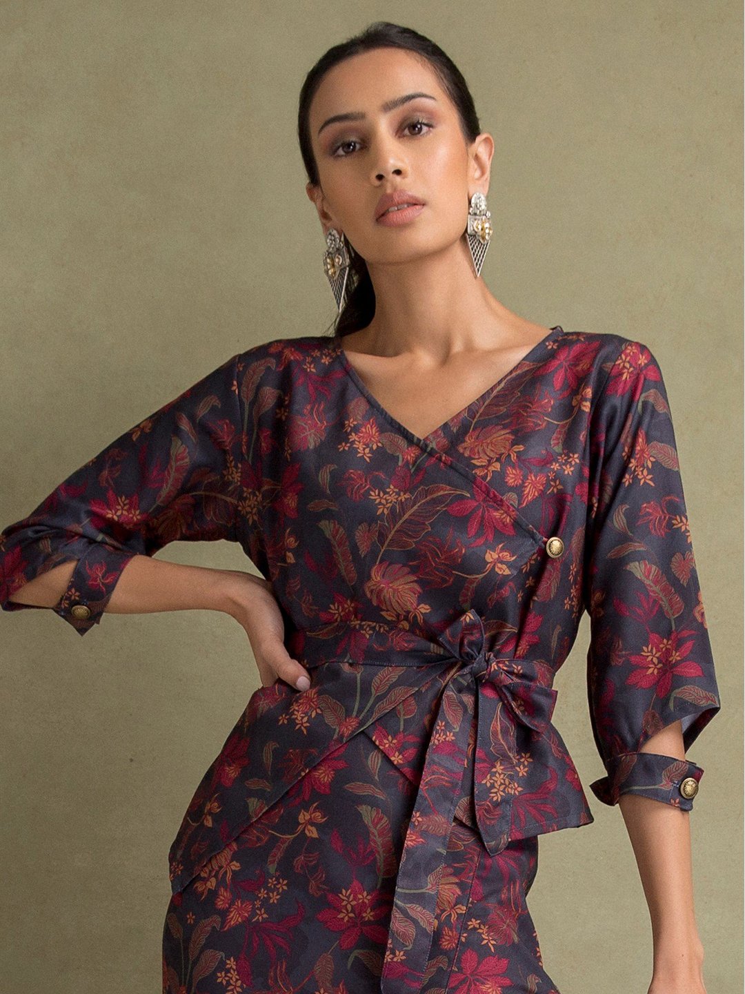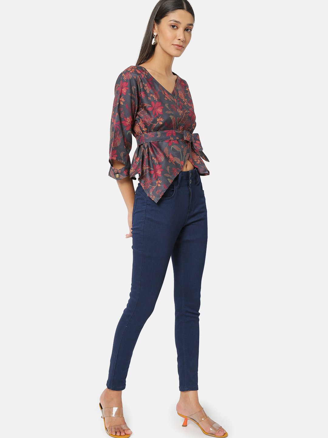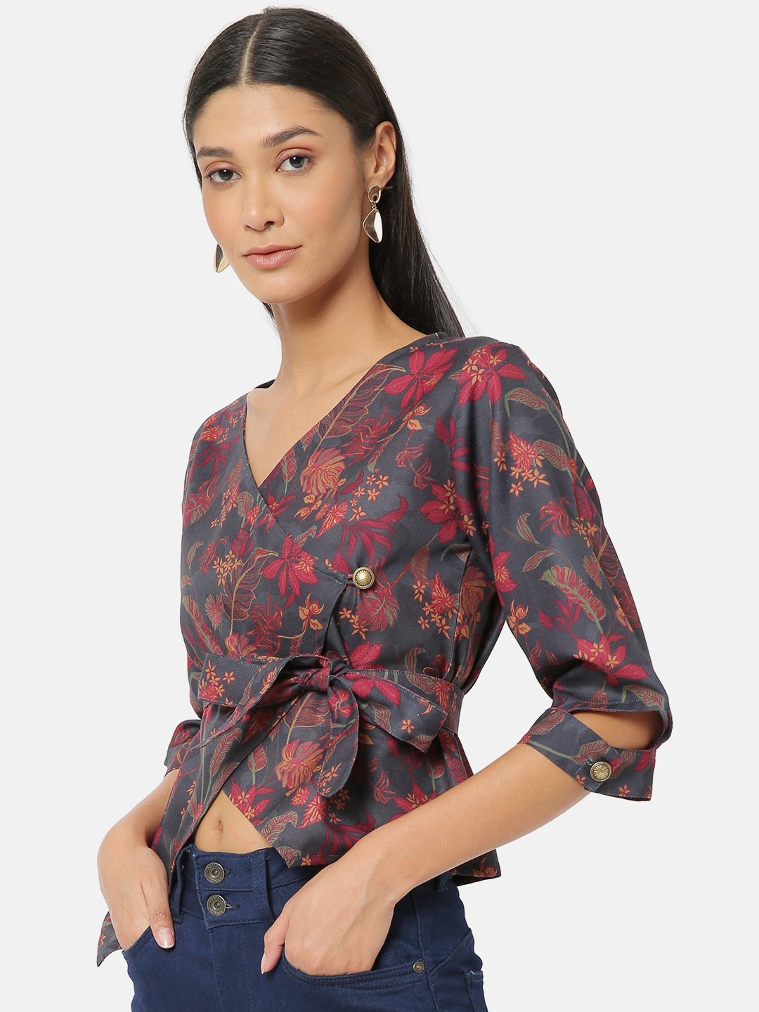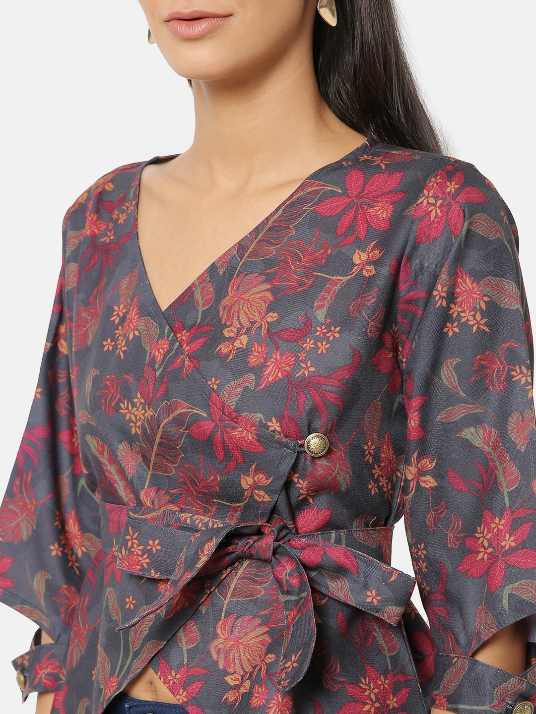 With its motifs inspired by nature, this printed overlap top comes with V-neckline and a contemporary tie-up detailing, with a cut-out button sleeve, the top gives you just the newness you require for a perfect day out.